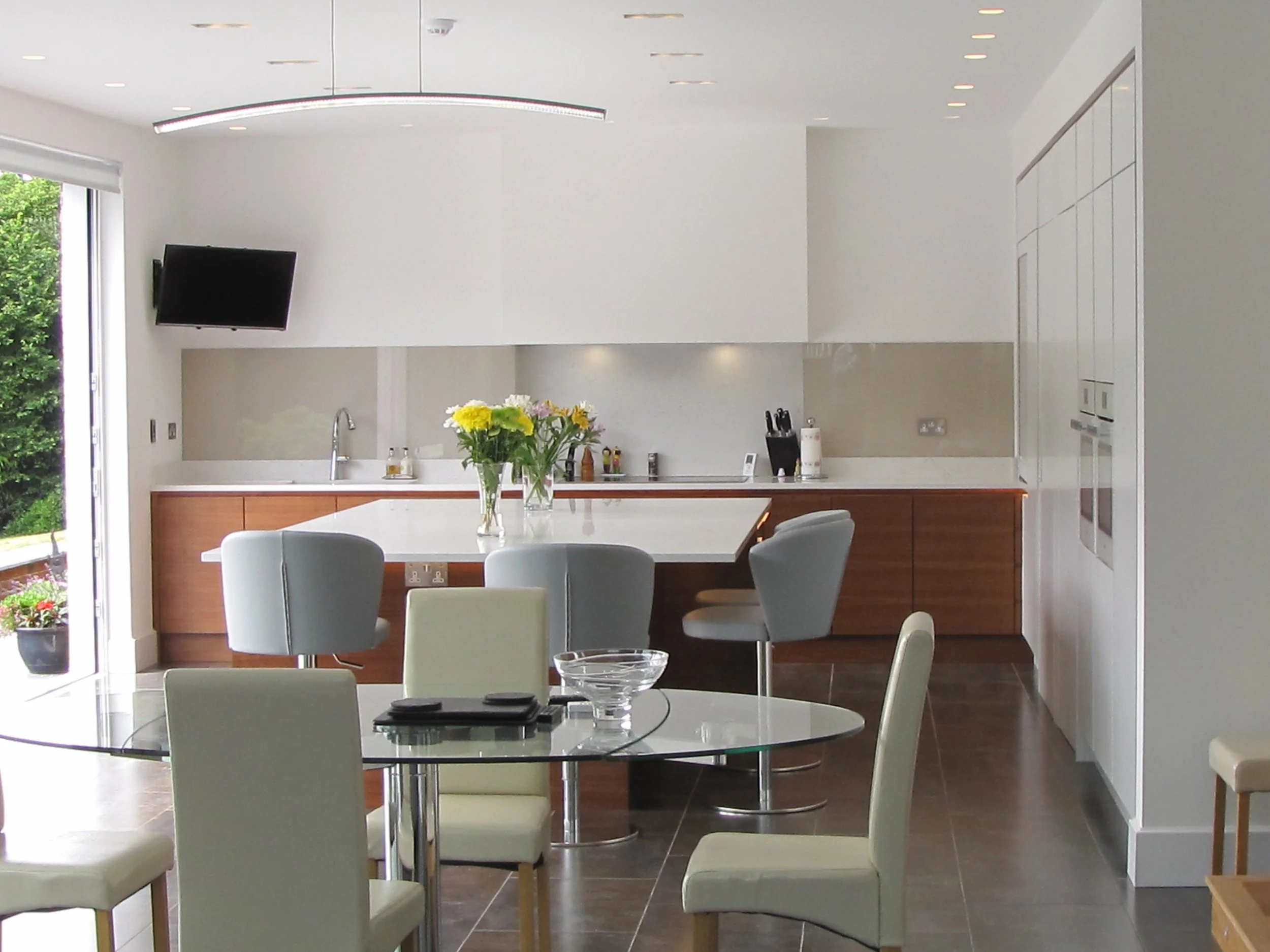 We have used Samsung 'Lucern Lake' Quartstone worktops, and Miele white glass appliances to keep within the colour scheme of this kitchen.