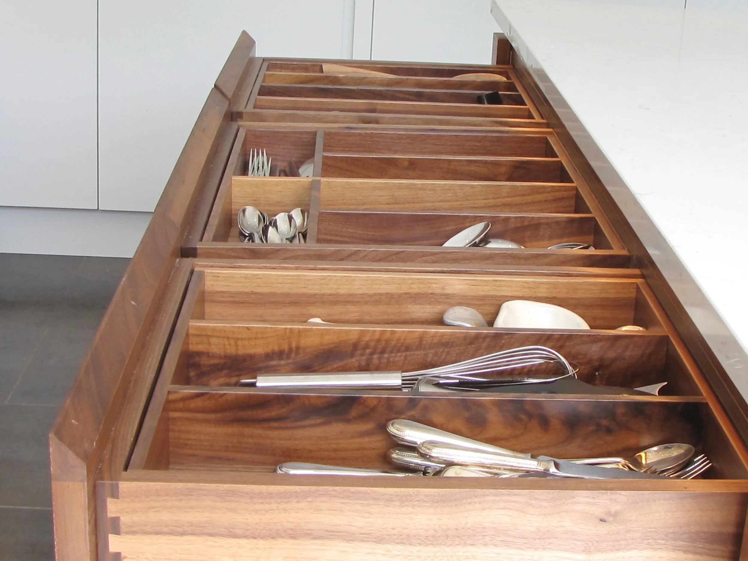 A hand made handle-less kitchen with recessed walnut finger rail.