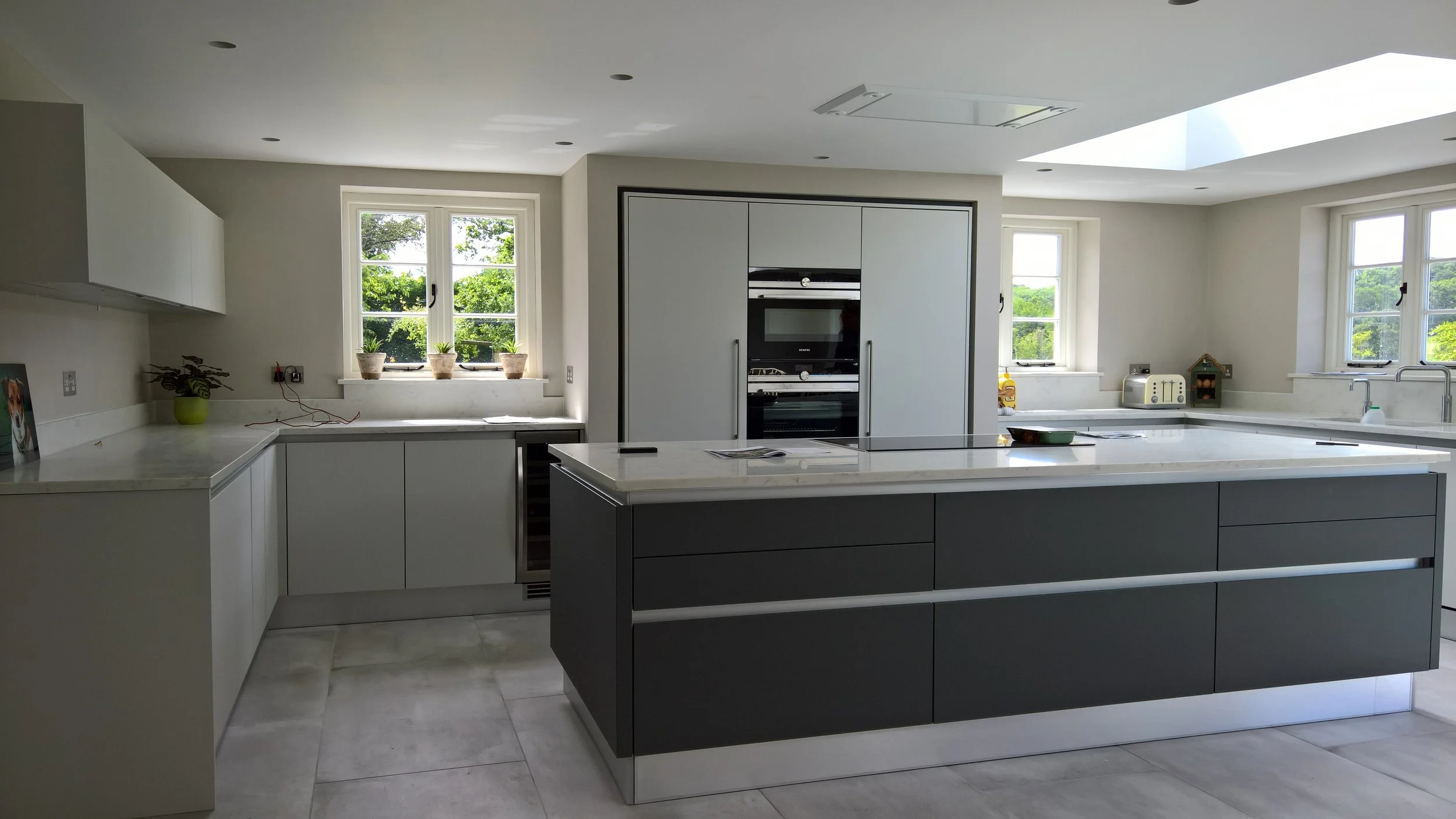 This kitchen has been completed in Rococo handle-less matt lacquer 'light grey' for all units with a feature island and framing around the centralised tall housings in 'mid grey'.