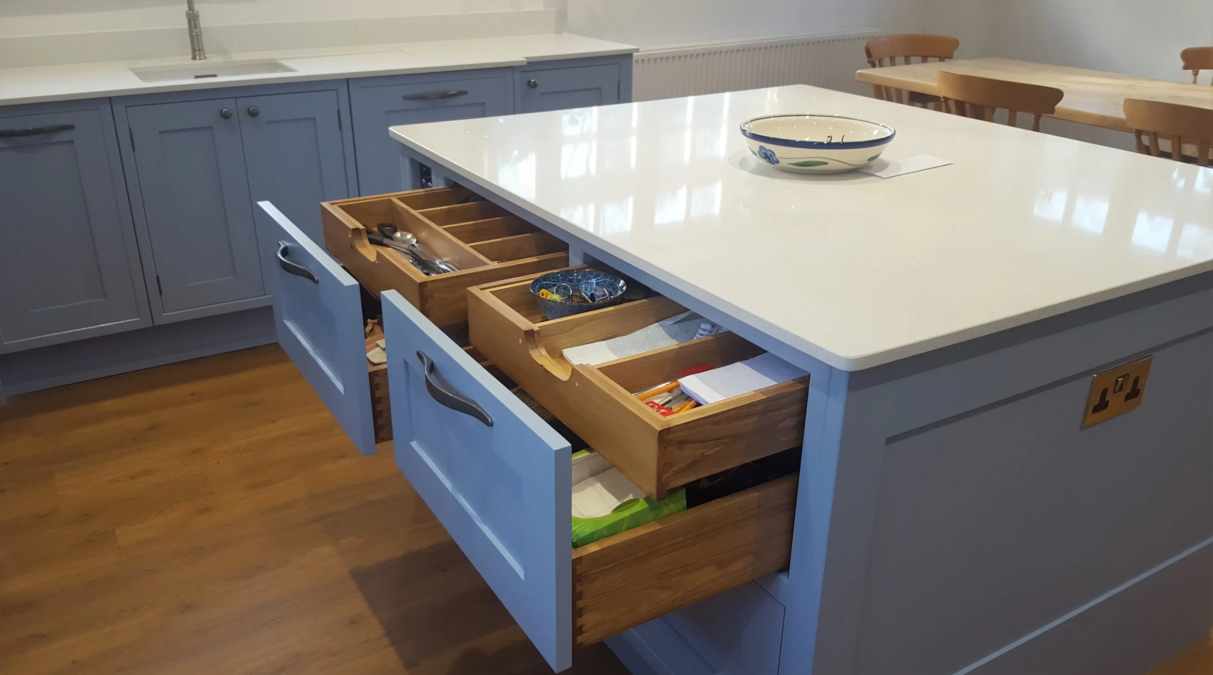 A clean simple shaker door within a chamfered frame. Frame work separating drawers and appliances. Reduced depth pantry with interior lighting on sensor switch. Deep drawers with hidden interior drawers and Oak cutlery and utensil inserts.