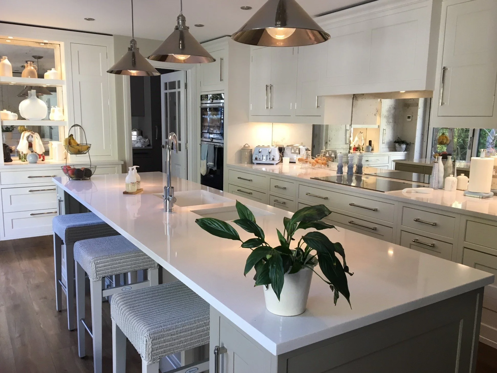 Armac martin chrome bar handles match with the boiling water tap and silver antique mirror splash backs. We have paired this all with Siemens appliances and a bespoke lit larder.