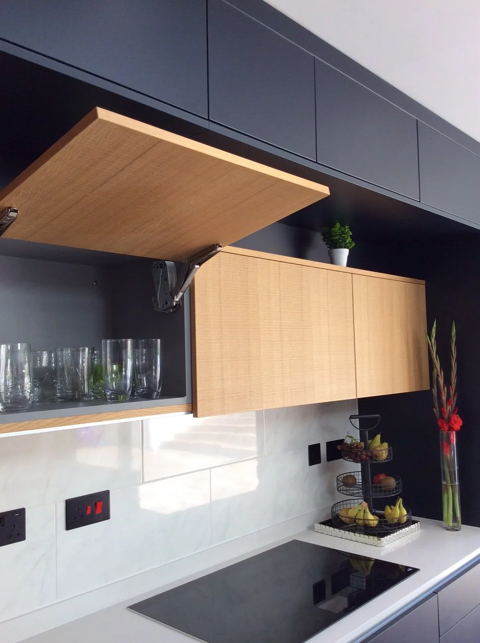 Stunning contemporary handle-less kitchen - in a smooth matt lacquer from the Crown Zeluso colour range. Bespoke size units were created to maximise storage above the hob, housing the extractor, and a butler style pantry with bifold doors all in a sawn oak veneer to contrast the smooth lacquer, adding texture and a warmth to the design, as well as breaking up the expanse of the dark blue. Accents of the sawn oak are in an open display area on the Island linking this to the wall run.
