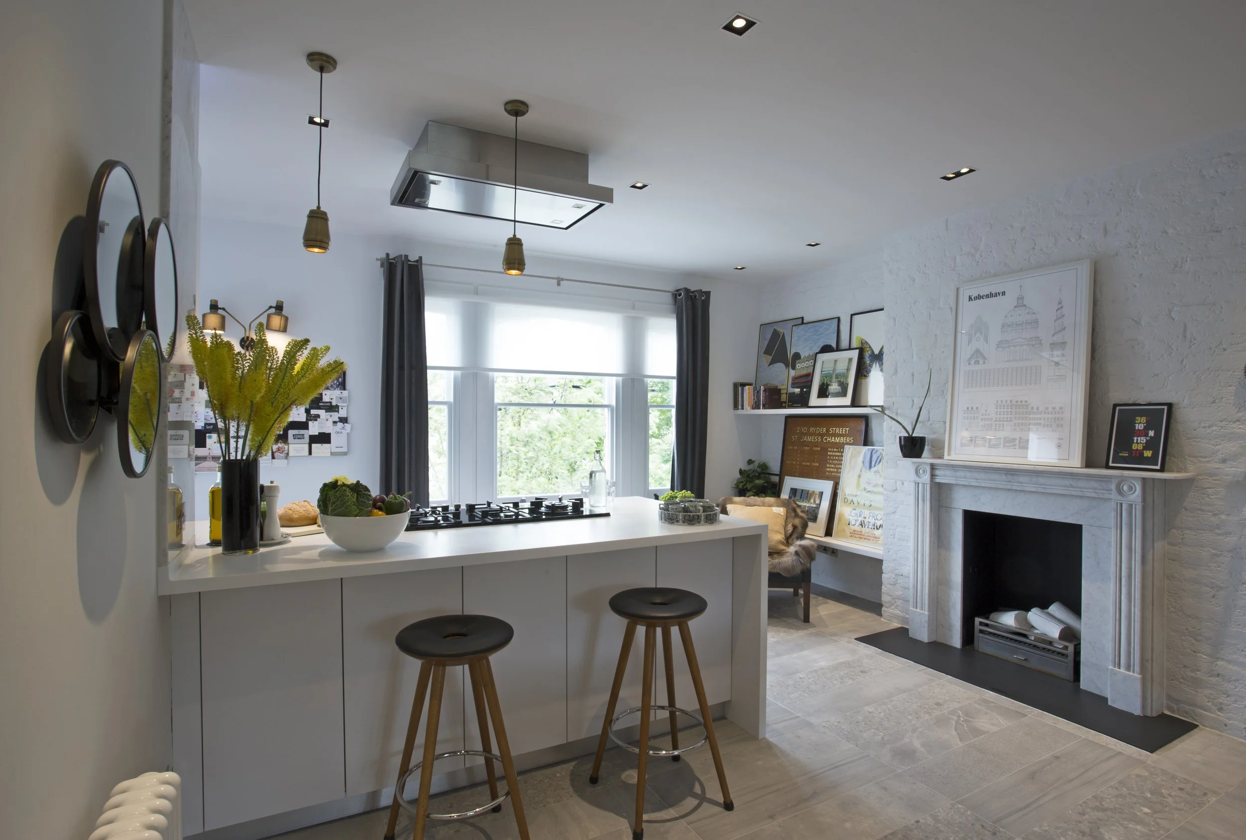 The handle-less rail maintains the clean lines, with rebaited lighting under the wall units and the 50mm thick white Corian worktops highlighting the linear look. Lighting above the wall units accentuates the use of marble cladding, bringing the element of luxury and uniqueness from the markings within the marble, tying the whole space together.