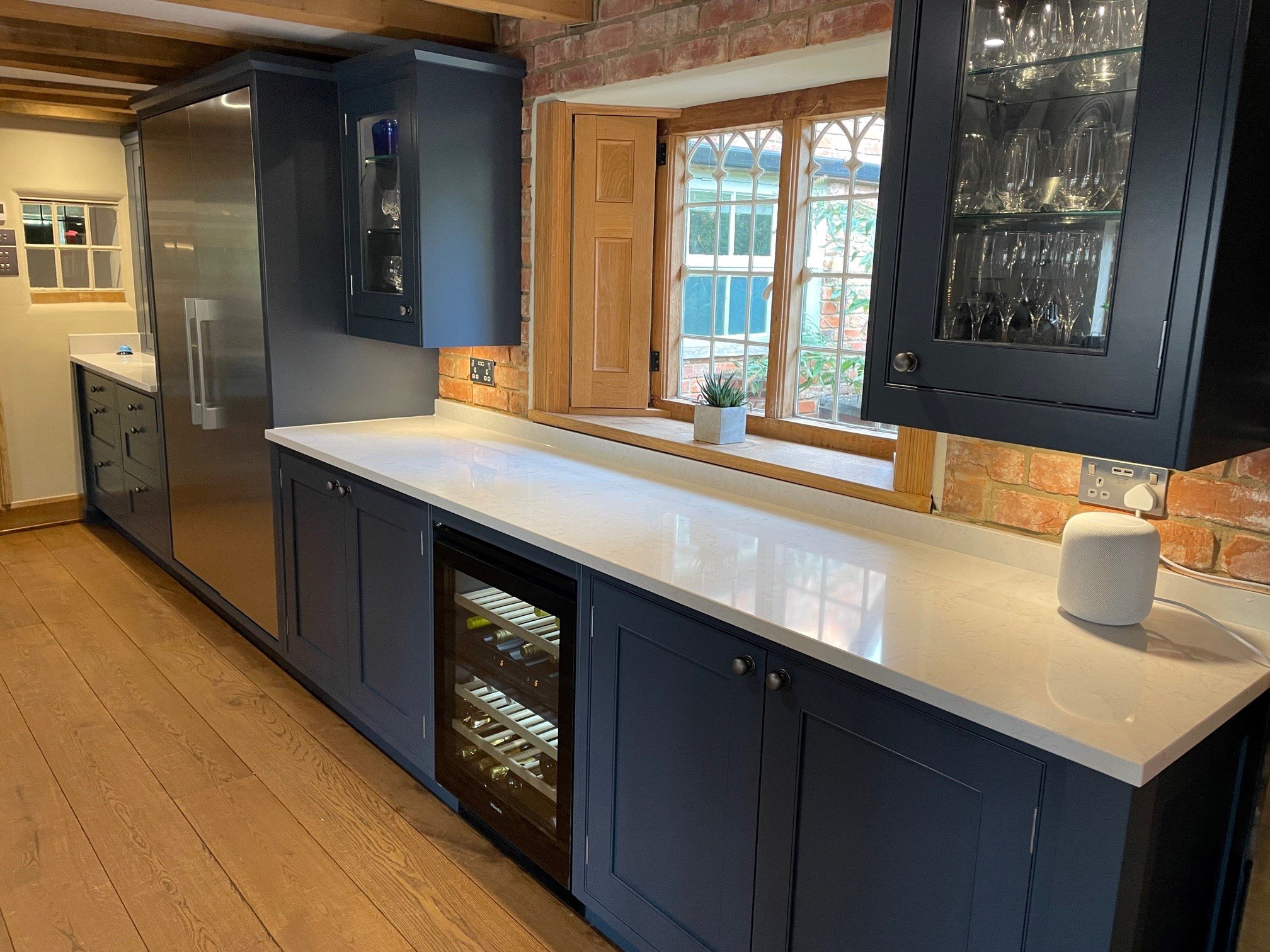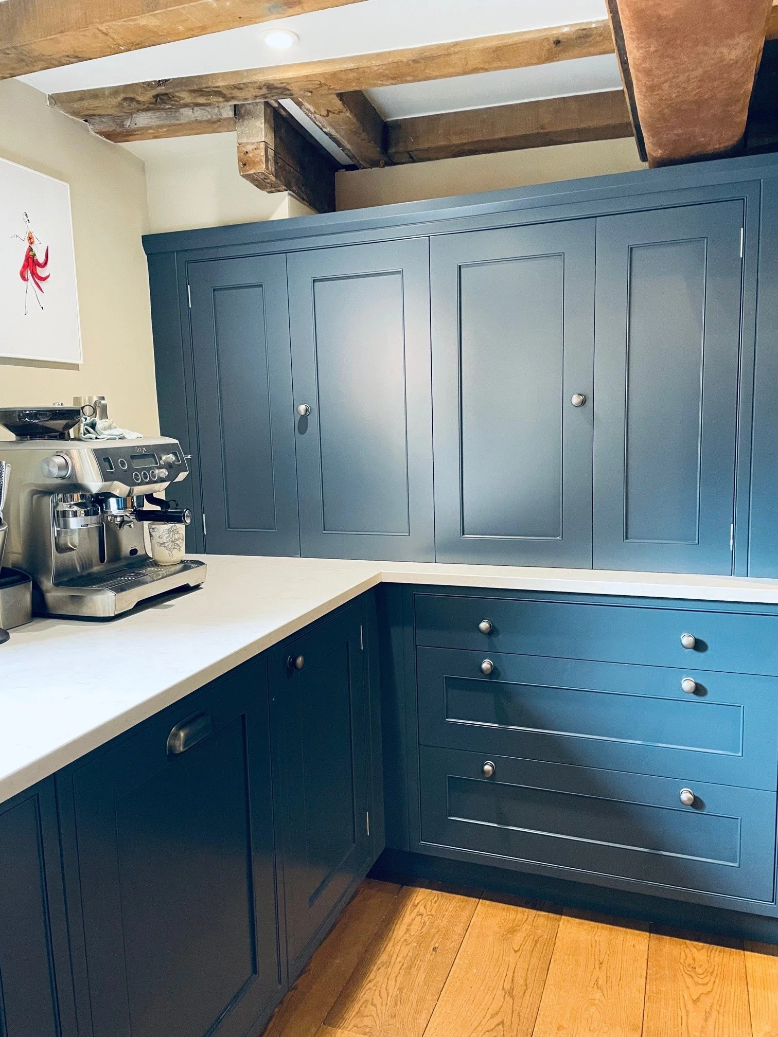 Hand painted units painted in a striking deep blue compliments the real wood floors and oak feature structures and beams. Elements of the contemporary are integrated in the bespoke steel doors for the fridge and freezer along with the steel touches on the extractor and ovens.