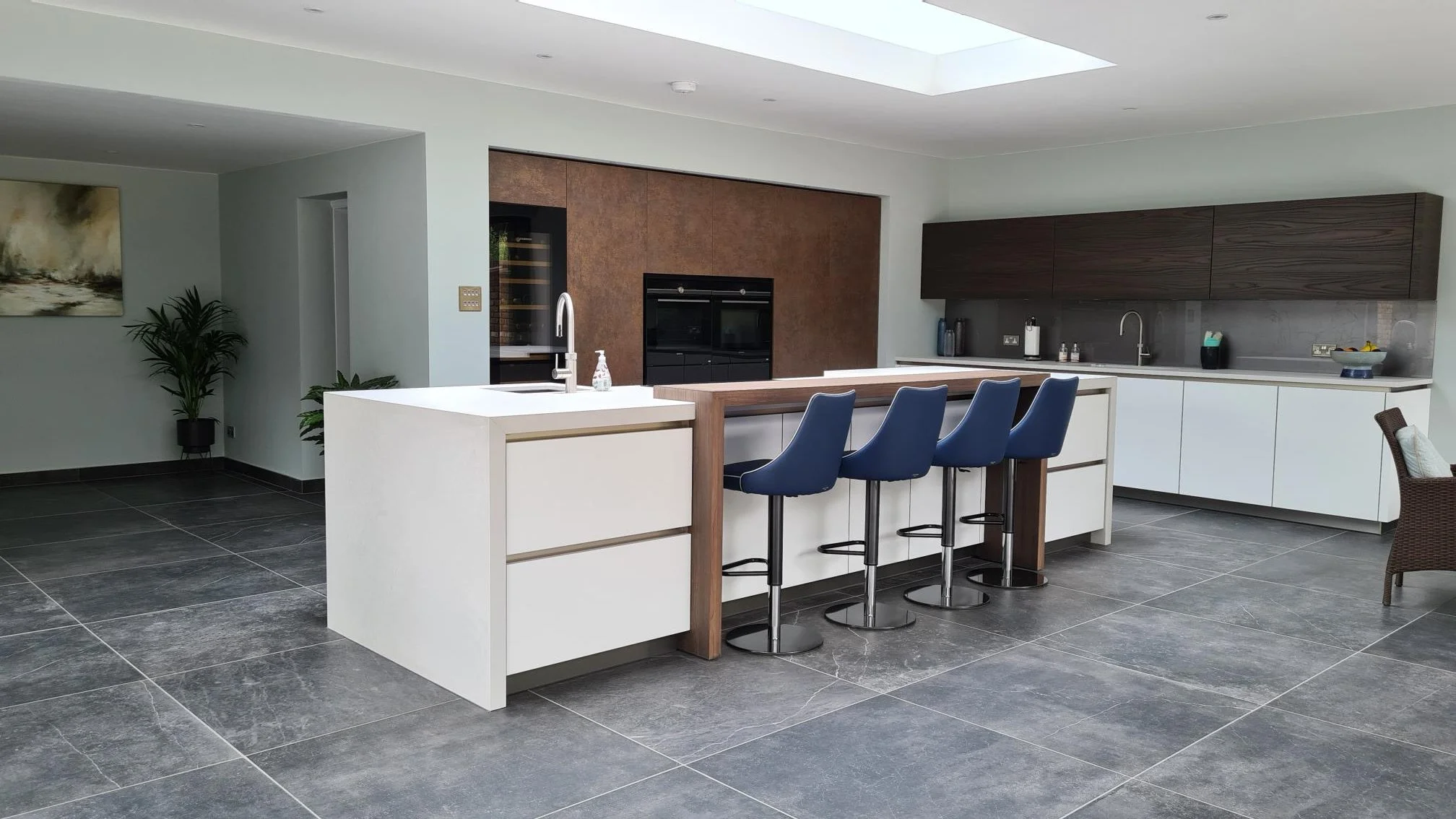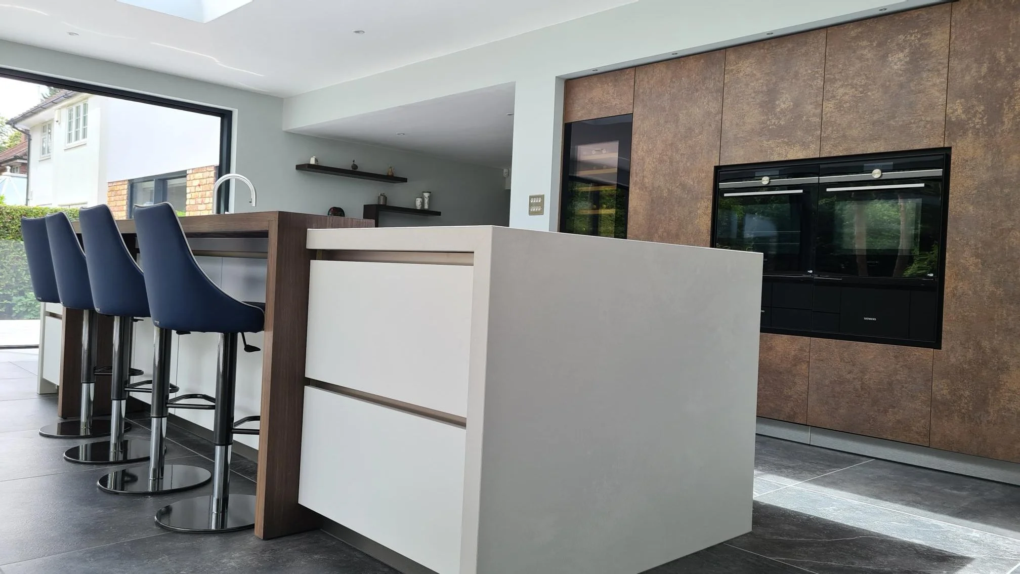 A stunning contemporary Warendorf kitchen which fits perfectly into the clients new beautifully detailed extension. A mix of door finishes including a ‘Ferro Bronze’ back wall with Siemens ovens and Liebherr wine cooler inset.