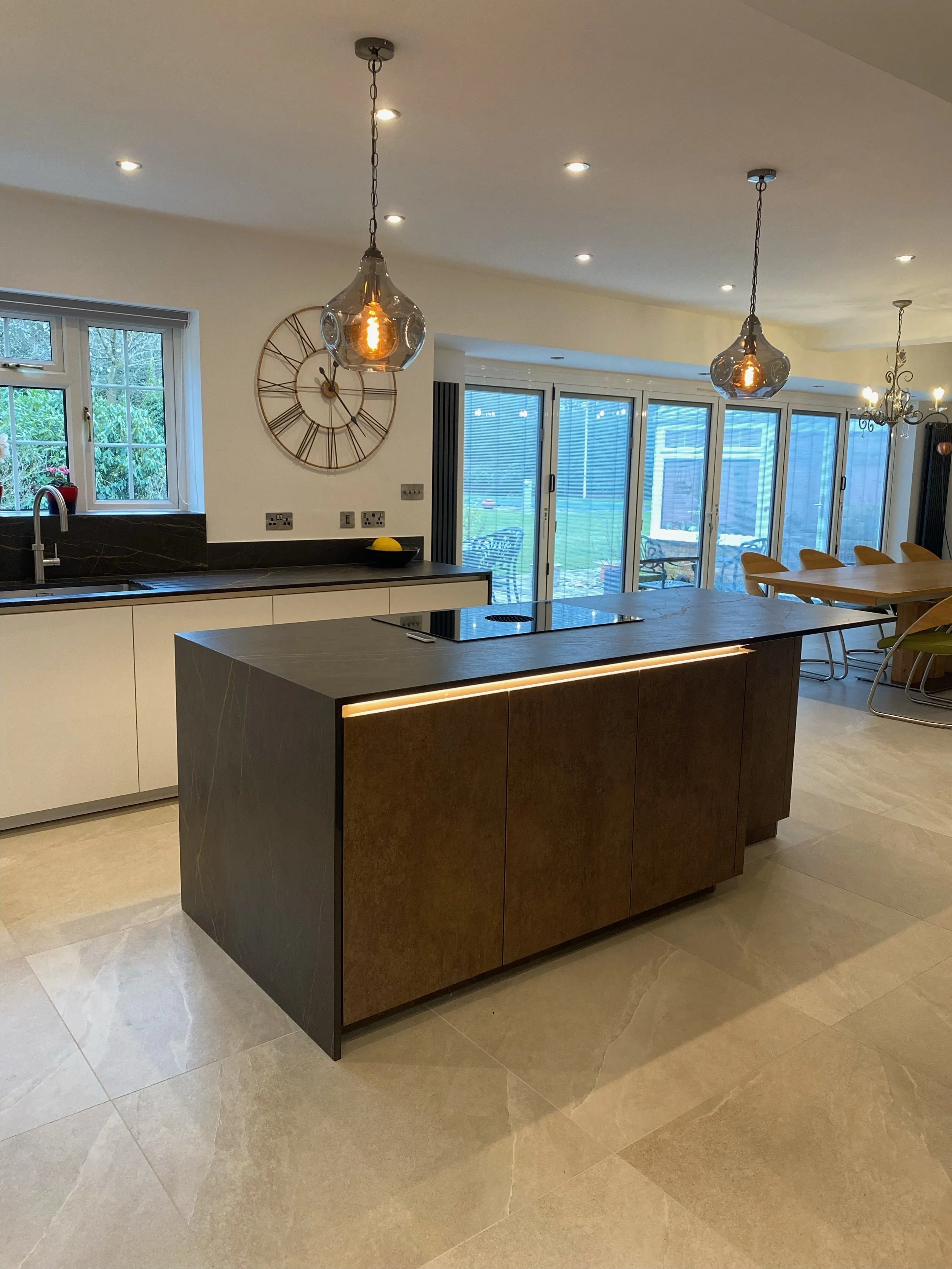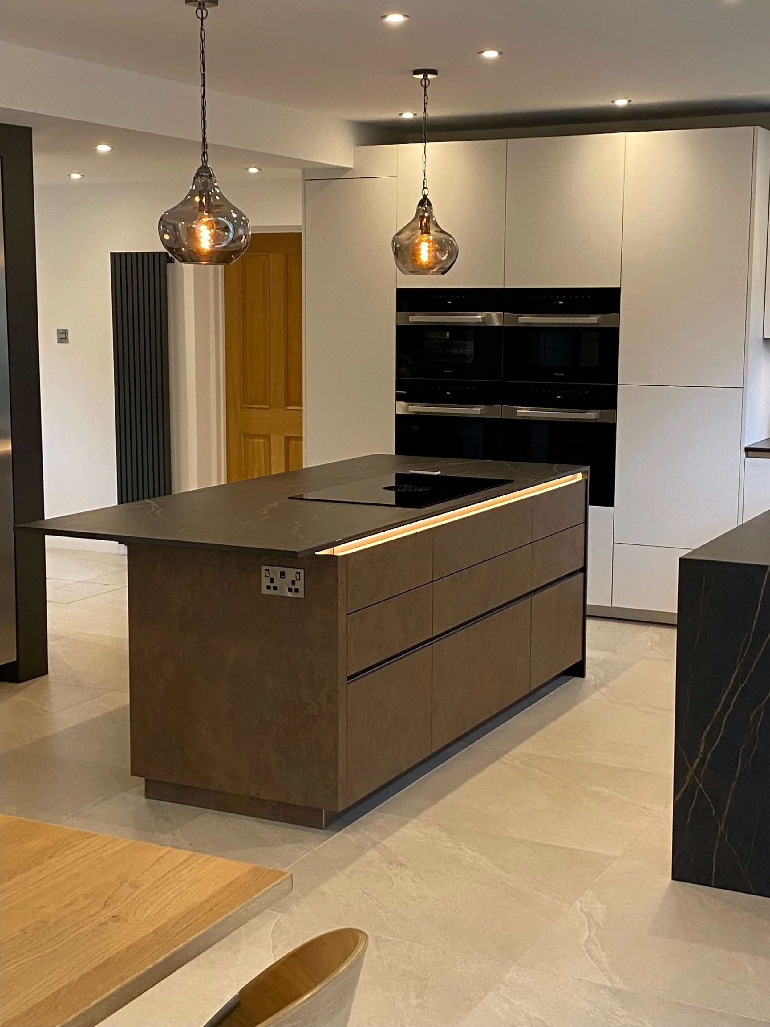 The main feature of this kitchen was the striking island colours with its Ferro Bronzed doors complimented by Dekton’s black Laurent worksurface with its burnt orange veins running through it. The Bora X Pure venting hob meant that a large amount of cooking could be done with extremely efficient extraction of smells whilst having nothing imposing overhead spoiling the view down to the bank of Miele ovens.